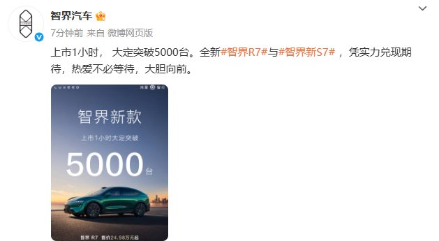 【CNMO科技消息】8月25日,智界汽车官方宣布,新款智界R7和智界S7上市1小时大定突破5000台。
